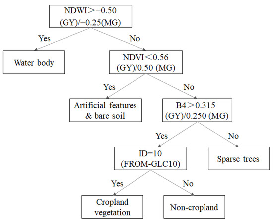 Decision tree filtering rules for the removal of non-cropland objects. Note that GY represents Guoyang and MG denotes Mingguang, respectively; and B4 is the reflectance of the near-infrared band.