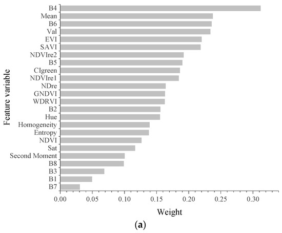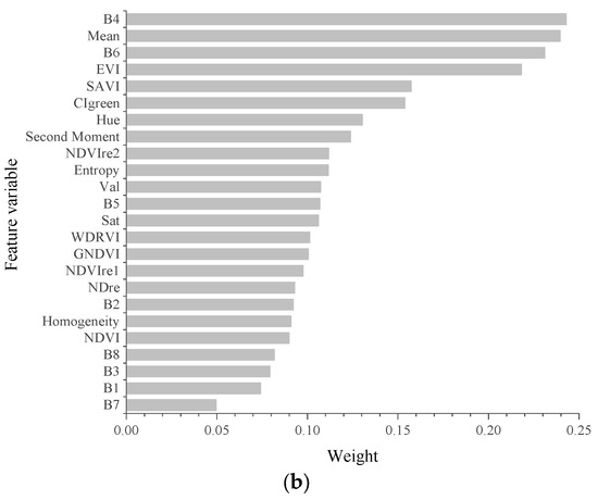 Based on the GF-6 WFV image after removing non-cropland pixels, sample points covering major land cover types were selected to create region of interest. The numerical values of candidate features were extracted, and the ReliefF algorithm was applied to evaluate the importance of 24 candidate feature variables in soybean identification. Results showed that for the Guoyang study area, the NIR band with a central wavelength of 830 nm (B4) ranked first, indicating that this feature contributed the most to soybean identification. The ‘Mean’ texture feature ranked second and the red edge-2 band (B6) ranked third, both of which were also conductive to realizing soybean-field extraction. In addition, EVI and SAVI were significant for soybean mapping compared to other vegetation indices (Figure 6a). For the Mingguang study area, the most prominent spectral features were the NIR band (B4) and red edge-2 band (B6), and the ‘Mean’ texture feature also demonstrated advantages. Among all vegetation indices, EVI, SAVI, and CIgreen ranked higher (Figure 6b), which was consistent with the evaluation results obtained in the Guoyang study area.