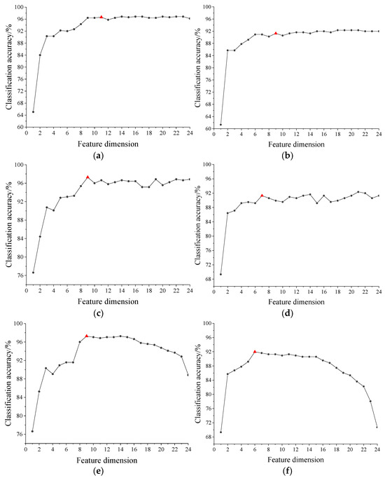Figure 7b,d,f illustrate the relationship between feature dimension and classification accuracy, as well as the determined dimensions for different classifiers in Mingguang. The RF classifier reached local maximum accuracy at a feature dimension of 9 (marked with red triangle in Figure 7b), and there was no significant change in accuracy afterwards, with only minor fluctuations within a small range. When the first 18 features were used as input, the accuracy reached its global maximum but was only 0.69% higher than that achieved with the first 9 features. Therefore, the ReliefF-RF model selected 6 out of the first 9 features as the optimum feature subset. Similarly, the ReliefF-BPNN model had the optimal feature dimension of 7, with 6 features selected; the ReliefF-SVM model also identified 6 optimum features (Figure 7f).