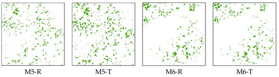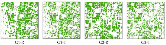 The extraction results of ReliefF-SVM model and the corresponding ground truth in those ground samples in Guoyang. Note that ‘R’ represents the result, and ‘T’ indicates the ground truth; the soybean planting areas are shown in green.