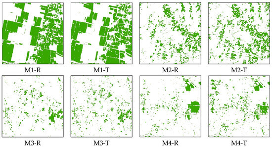 The extraction results of Relief-SVM model and the corresponding ground truth in those ground samples in Mingguang. Note that ‘R’ represents the result, and ‘T’ indicates the ground truth; the soybean planting areas are shown in green.