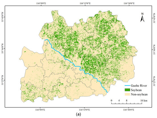 Using the SVM classifier and the selected feature subset as input, the soybean planting areas in Guoyang and Mingguang were extracted. The soybean fields in Guoyang were mainly distributed in the region north of the Guohe River, which dominated among summer crops; the region south of the Guohe River had a smaller cultivation scale and a more scattered distribution (Figure 10a). In addition, the prevalence of smallholder farming practices resulted in widespread mixed cropping of soybean and other summer crops, there were few large-size contiguous soybean fields. The scale of soybean cultivation in Mingguang was significantly smaller than that in Guoyang. The soybean fields were mainly concentrated in the northeastern part and the north bank of Nushan Lake, where several large farms were located. The cropland here had been leveled and modified to facilitate mechanized farming, making it more regular and equipped with agricultural infrastructure, hence large-scale contiguous planting was the main pattern in this area. In other areas of Mingguang, the distribution of soybean fields was highly dispersed, especially in the southern mountainous region where only a few isolated soybean fields could be observed (Figure 10b).