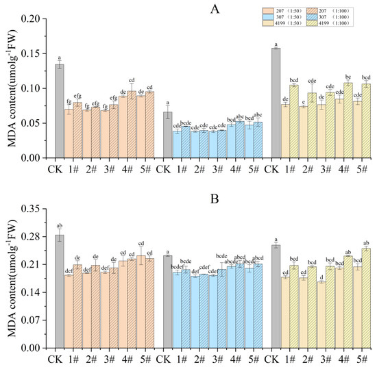 The concentration of MDA in wheat flag leaves was analyzed during the turning green stage and grain filling stage. The results indicate that the MDA content during the turning green stage was significantly reduced in seeds coated with 1# to 5# at 1:50 compared to CK. Compared to 1#, seeds coated with 2# to 5# at 1:50 had decreased MDA content, and the difference was significant for 207 coated with 2# and 5# (Figure 1A). During the grain filling stage, the only significant decrease in MDA content compared to CK was observed for seeds coated with 1# to 5# at 1:50, except for 4# and 5# in 307. Compared with 1#, seeds coated with 2# to 5# at 1:50 had decreased MDA content; however, the difference was not significant. (Figure 1B). Seeds coated with 1# to 5# at 1:50 had lower MDA content than those coated at 1:100; again, however, the difference was not significant. Among all the treatments, seeds coated with 2# at 1:50 showed the lowest MDA content. Compared with CK, the MDA content during the turning green stage was decreased by 34%, 22%, and 24%, 207, 307, and 4199, respectively, while the MDA content during the grain filling stage was decreased by 49%, 42%, and 53%, respectively.