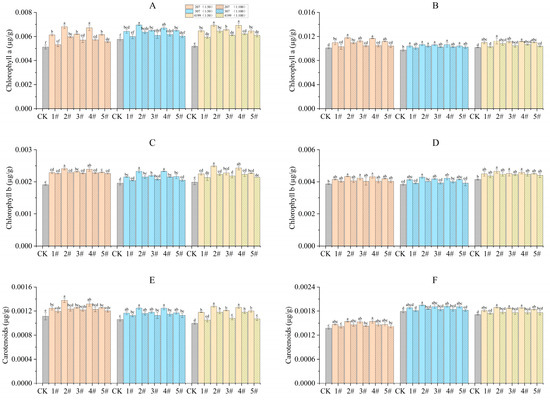 Compared with CK, 2# was the most effective in increasing chlorophyll content during the turning green stage, by 33%, 20%, and 34% for chlorophyll a content in 207, 307, and 4199, respectively, by 26%, 19%, and 25% for chlorophyll b content, and by 24%, 18%, and 28% for carotenoids content. During the grain filling stage, chlorophyll a content was increased by 17%, 9%, and 11%, respectively in 207, 307, and 4199, by 12%, 11%, and 12% for chlorophyll b content, and by 12%, 9%, and 11% for carotenoids content in comparison to CK (Figure 3).