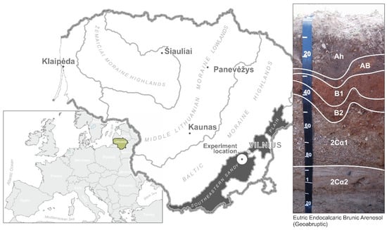 This research was conducted as a long-term trial of the LAMMC Voke Branch. The experiments were located in eastern Lithuania (NW: 54°33′52.27″ N, 25°05′12.68″ E; NE: 54°33′52.01″ N, 25°05′14.60″ E; SE: 54° 33′48.23″ N, 25°05′12.97″ E, SW: 54°33′48.56″ N, 25°05′10.86″ E). The experimental site represents an agricultural landscape of a stretch of the morainic hummocky uplands of eastern Lithuania. This stretch was formed as a terminal moraine; therefore, it is characterised by an upper layer of sandy loam and loamy sand parent material, which form the sandy soils under study (Figure 1). The experiment was conducted on arable soil that has been used for more than 50 years (until 1995) to grow various grain crops and is fertilised with mineral fertilisers. Table 1 presents the treatments and experimental design.
