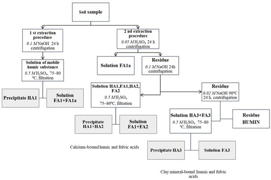 Soil samples were collected from each of the six plots at two soil depths (0–15 and 15–25 cm), with four replicates (n = 48). The air-dried soil samples were crushed and sieved through 2 mm and 0.25 mm sieves and homogeneously mixed before the visible roots and plant residues were removed manually. Total soil nitrogen (N) was determined using a spectrophotometric measurement procedure at a wavelength of 655 nm after mineralisation with sulfuric acid (H2SO4). The SOC content was determined according to Nikitin’s modified Tyurin method [32], which consisted of dichromate digestion at 160 °C for 30 min and a spectrophotometric measurement at a wavelength of 590 nm using glucose as a standard. The group and fractional compositions of the soil humus were determined using Ponomareva and Plotnikova’s (1980) [33] version of the Tyurin method according to the scheme presented in Figure 2. The following humic acid fractions were identified: HA1—free and weakly bound with clay minerals, referred to as the mobile humic acids fraction; HA2—bound with calcium; HA3—strongly bound with soil clay minerals; the fulvic acid fractions: FA1a—the so-called aggressive fulvic acid fraction; FA1—mobile; FA2—bound with calcium; FA3—bound with soil clay mineral fulvic acid fractions. A more detailed description of the fractionation methodology can be found in the previous studies [27,28,32,33,34].