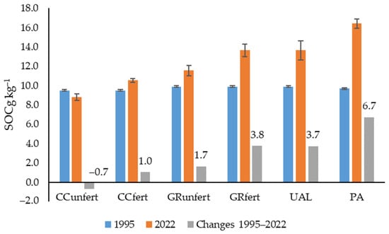 Changes in SOC amounts (1995–2022) in the topsoil of Arenosols with different uses. Notes: CCunfert—non-fertilised crop cultivation; CCfert—fertilised crop cultivation; GRunfert—non-fertilised cut grassland cultivation; GRfert—fertilised cut grassland cultivation; UAL—uncultivated abandoned land; PA—pine afforestation field. The standard errors are marked.