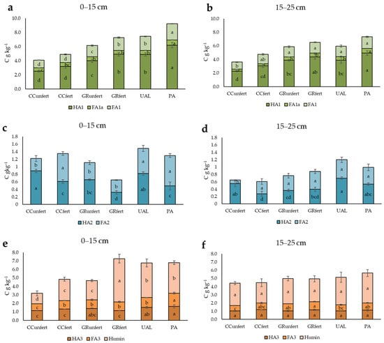 The HA3 and FA3 fractions accounted for 17–23% (0–15 cm) and 14–20% (15–25 cm) of the total SOC, respectively. The highest amounts of HA3 and FA3 were determined in the PA soil use groups at HA3 1.6 C g kg−1 and FA3 1.5 C g kg−1, and conversely, the lowest were CCunfert HA3 1.14 C g kg−1 and FA3 0.799 C g kg−1. In the other soil use groups, similar amounts of HA3 and FA3 prevailed.