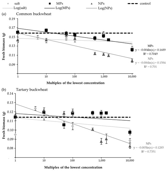The effects of different concentrations and Cu compounds on fresh biomass of (a) common buckwheat and (b) Tartary buckwheat seedlings. Data are presented as mean ± SE (n = 15) and the lowest concentrations were for Cu salt 0.01 mg L−1, for CuO MPs and NPs 0.1 mg L−1. Trendline right of graph indicate biomass reduction with increasing Cu concentration. Legend: control—untreated seedlings, salt—CuSO4 ∙ 5H2O; MPs—CuO microparticles, NPs—CuO nanoparticles.