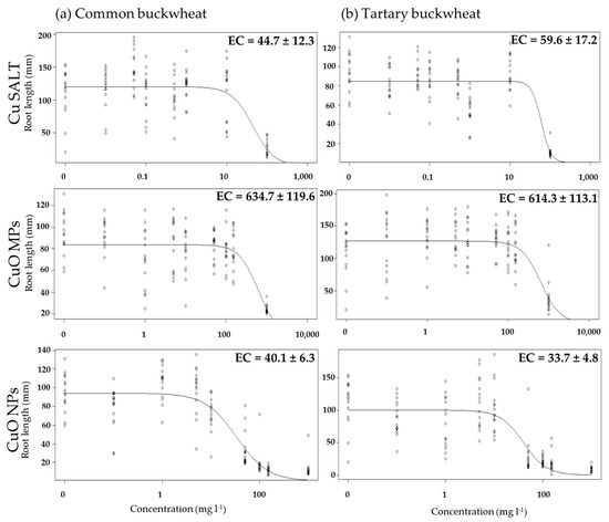 The effects of different Cu compounds on root length of treated buckwheat seedlings with defined effective concentration (EC) (mg L−1) for (a) common buckwheat, (b) Tartary buckwheat, from top to bottom: Cu salt, CuO MPs and CuO NPs. Legend: Cu salt—CuSO4 ∙ 5H2O; CuO MPs—CuO microparticles, CuO NPs—CuO nanoparticles.