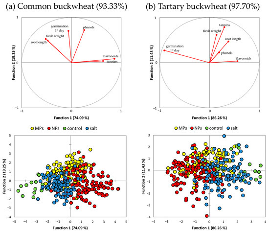 Linear discriminant analysis plot for measured parameters (germination first day, fresh weight, root length, phenols, flavonoids, tannins) of (a) common and (b) Tartary buckwheat seeds and seedlings in response to different Cu compounds. Legend: control—untreated seedlings, salt—CuSO4 ∙ 5H2O; MPs—CuO microparticles, NPs—CuO nanoparticles.