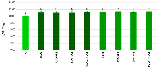 Soil organic carbon (SOC) content. The same letter means not significantly different. C—control without fertilization; UAN—urea ammonium nitrate; UI—urease inhibitor; NI—nitrification inhibitor; FYM—farmyard manure with N mineral fertilizer base.