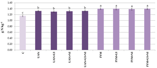 Total nitrogen (TN) content. The same letter means not significantly different. C—control without fertilization; UAN—urea ammonium nitrate; UI—urease inhibitor; NI—nitrification inhibitor; FYM—farmyard manure with N mineral fertilizer base.