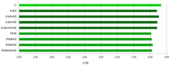 SOC/TN ratios. C—control without fertilization; UAN—urea ammonium nitrate; UI—urease inhibitor; NI—nitrification inhibitor; FYM—farmyard manure with N mineral fertilizer base.
