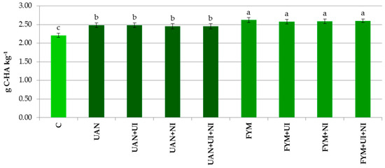 Content of humic acids (C-HA). The same letter means not significantly different. C—control without fertilization; UAN—urea ammonium nitrate; UI—urease inhibitor; NI—nitrification inhibitor; FYM—farmyard manure with N mineral fertilizer base.