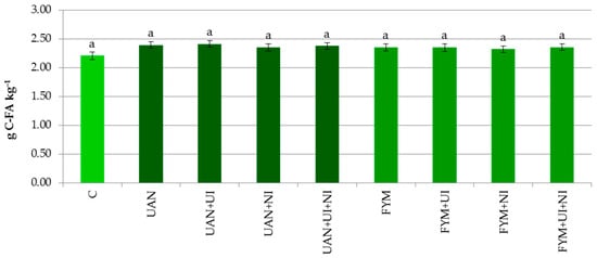 Content of fulvic acids (C-FA). The same letter means not significantly different. C—control without fertilization; UAN—urea ammonium nitrate; UI—urease inhibitor; NI—nitrification inhibitor; FYM—farmyard manure with N mineral fertilizer base.