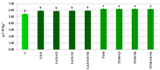 Content of humins (C-H). The same letter means not significantly different. C—control without fertilization; UAN—urea ammonium nitrate; UI—urease inhibitor; NI—nitrification inhibitor; FYM—farmyard manure with N mineral fertilizer base.