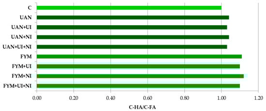 The ratios between C-HA and C-FA expressed as a humification index (HI), indicating the intensity of humification [34,36] were higher in the soils of the FYM treatments (1.10–1.12) than in the plots with UAN (1.0–1.04) (Figure 7). According to some authors [35], HI values > 1 showed longer residence periods for the humic acid fraction in soils. In the present study, urease and nitrification inhibitors did not have significant impacts on the HS fractions (Figure 4, Figure 5 and Figure 6).