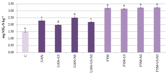 Ammonium content (NH4-N) in the soil. The same letter means not significantly different. C—control without fertilization; UAN—urea ammonium nitrate; UI—urease inhibitor; NI—nitrification inhibitor; FYM—farmyard manure with N mineral fertilizer base.