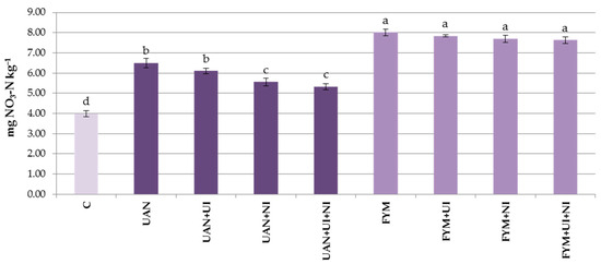 Nitrate content (NO3-N) in the soil. The same letter means not significantly different. C—control without fertilization; UAN—urea ammonium nitrate; UI—urease inhibitor; NI—nitrification inhibitor; FYM—farmyard manure with N mineral fertilizer base.