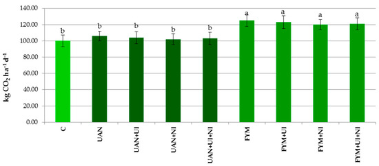 CO2 emission in a maize agroecosystem. The same letter means not significantly different. C—control without fertilization; UAN—urea ammonium nitrate; UI—urease inhibitor; NI—nitrification inhibitor; FYM—farmyard manure with N mineral fertilizer base.