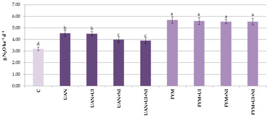 N2O emissions in a maize agroecosystem. The same letter means not significantly different. C—control without fertilization; UAN—urea ammonium nitrate; UI—urease inhibitor; NI—nitrification inhibitor; FYM—farmyard manure with N mineral fertilizer base.