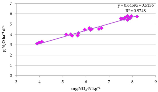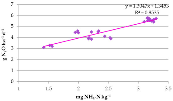 There were positive correlations between the emission of N2O and concentrations of SOC (r = 0.786), TN (r = 0.884), C-HA (r = 0.931), C-H (r = 0.907), NH4-N (r = 0.924), and NO3-N (r = 0.987) (Table 2), which is consistent with other studies [17,53,55]. The high correlation between N2O emission and NH4-N concentration in the tested soil confirms that nitrification can be an important source of N2O [32,45]. The soil mineral N content is regarded as one of the key drivers of N2O emissions since ammonium and nitrate serve as sources for nitrification and denitrification, respectively, which are processes that produce nitrous oxide [49,55]. Some authors [53] reported that the NO3- intensity explained 80–90% of the variability in N2O emissions. In the present experiment, more than 97.48% and 85.35% of the variability in N2O emissions may be explained by the regression equation, in which the explanatory variables are NO3-N and NH4-N, respectively (Figure 12 and Figure 13). According to some authors [55], NH4-N enhances soil N2O emission only at a lower soil moisture.