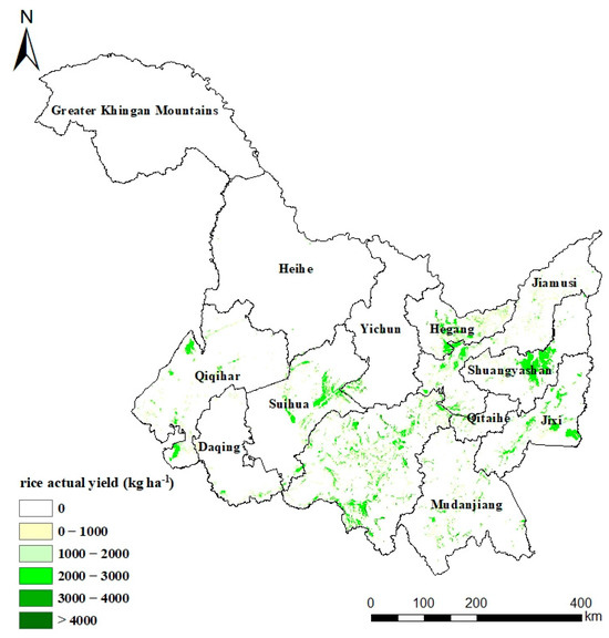 The total rice actual production in Heilongjiang Province estimated by the VPM model in 2000 was 5.17 million tons. With a paddy field area of 1.47 million ha in 2000, the mean rice actual yield was calculated to be 3526 kg ha−1. Analysis of the spatial distribution of rice actual yields in Heilongjiang Province in 2000 revealed higher rice actual yields in the northeastern regions compared to other regions (Figure 2). The regions exhibiting rice yields ranging from 2000 to approximately 3000 kg ha−1 were found in Shuangyashan City, Hegang City, and Jixi City, and in some regions, the rice yields were higher than 3000 kg ha−1.