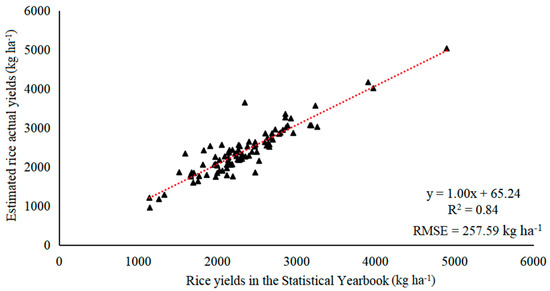 A linear regression analysis was performed to establish a relationship between the estimated rice actual yields and rice yields in 98 counties of Heilongjiang Province as reported in the Statistical Yearbook. The R2 was 0.84, p ≤ 0.01, RMSE = 257.59 kg ha−1, indicating a good correlation (Figure 3). Consequently, the trend in estimated rice actual yields reflected the trend in rice yields in the Statistical Yearbook. This result could be used to verify the accuracy of the VPM model.