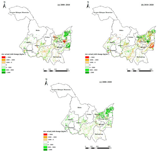 Figure 4 shows the spatial distribution of rice actual yield changes in Heilongjiang Province during the 2000–2020 period. From 2000 to 2010, the mean rice actual yield decreased by 1084 kg ha−1 while the total rice actual production increased by 2.49 million tons because the area of the paddy field increased by 514,700 ha (Figure 4a). The variation in rice actual yields across different regions of Heilongjiang Province was complex, with a great number of regions experiencing an increase rather than a decrease in rice actual yields. The rice actual yields increased by 1000~2000 kg ha−1 in most regions, with the exception of the northeast of Jiamusi City and Jixi City, where the actual yield increased by more than 2000 kg ha−1. Conversely, there were significant decreases in rice actual yields exceeding 2000 kg ha−1 in the center of Shuangyashan City and Hegang City, while most regions of Harbin City and Qitaihe City experienced a decrease of less than 1000 kg ha−1.