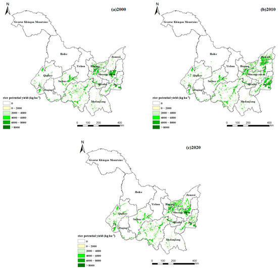 The total rice potential production in Heilongjiang Province for 2000, 2010, and 2020 was 15.10, 18.16, and 16.81 million tons, respectively, simulated by the GAEZ model, with the paddy field area of 2.19, 2.71, and 3.21 million ha, resulting in the mean rice potential yield of 6884, 6703, and 5238 kg ha−1, respectively. The spatial distribution of rice potential yields in Heilongjiang Province for the three years (Figure 5a–c) revealed that the eastern and southwestern regions exhibited relatively high yields, with most exceeding 4000 kg ha−1, and some reaching as high as 6000~8000 kg ha−1, primarily concentrated in Sanjiang Plain and Songnen Plain, such as Shuangyashan City, Hegang City, Suihua City and Jixi City. The major reason for this disparity lies in the predominant soil types of the Sanjiang Plain, which consist mainly of white slurry and meadow soils, as opposed to the Songnen Plain’s predominantly black soils characterized by high organic matter content and exceptional fertility, rendering them more conducive to rice cultivation.