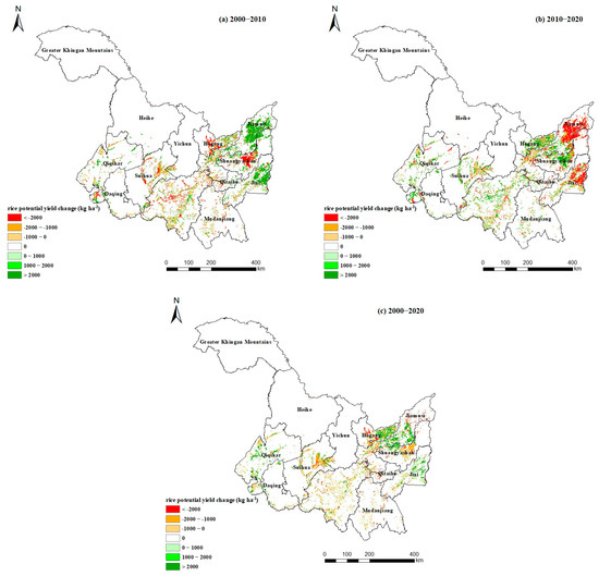 Spatial distribution of rice potential yield changes in Heilongjiang Province for the three periods: (a) 2000–2010, (b) 2010–2020, and (c) 2000–2020.