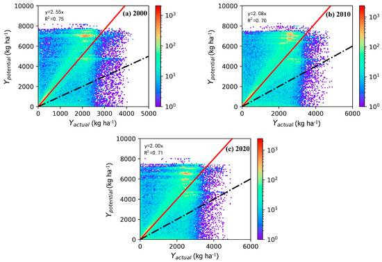 Correlation analysis between rice actual and potential yields for the three years: (a) 2000, (b) 2010, and (c) 2020.
