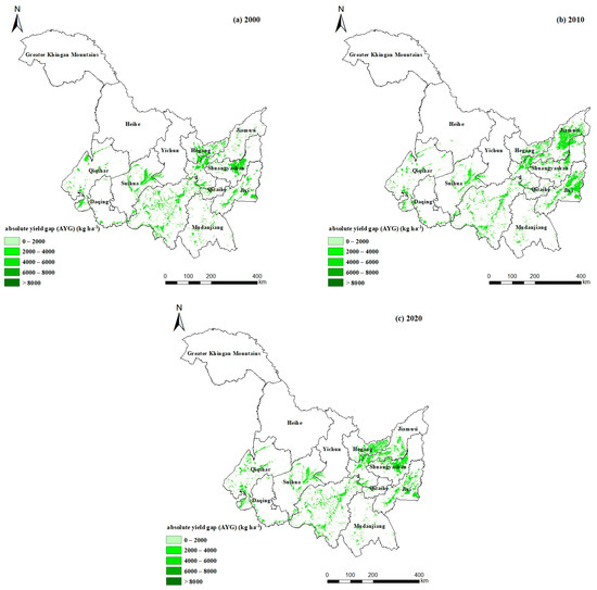 Absolute yield gaps (AYG) of rice actual and potential yields for the three years: (a) 2000, (b) 2010, and (c) 2020.