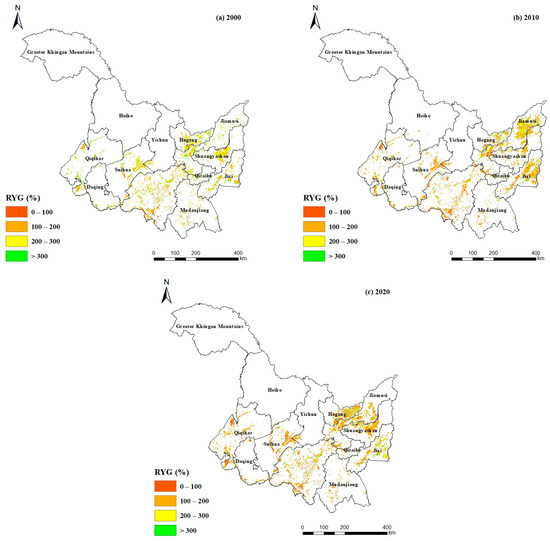 However, due to the different rice production capacities in different regions and the large gap in rice potential yields, the RYG may reflect the rice yield gap in different regions more accurately than the AYG. As can be seen in Figure 9a–c, the RYG varied greatly in different regions of Heilongjiang Province. In 2000, the RYG was 200~300% in most areas, indicating that the rice potential yields were 3~4 times the actual yields, such as Hegang City, Shuangyashan City, and Jixi City in Sanjiang Plain region in the northeast, Suihua City in the middle, and Harbin City in the south. The RYG in some areas was 100~200%, indicating that the rice potential yields were approximately two to three times the actual yields, such as Qitaihe City in the southwest, and the southern part of Harbin City, as well as parts of the Sanjiang Plain region. In a small number of regions, the RYG was greater than 300%, and the difference in rice yields was even larger. In 2010, there was a smaller RYG than in 2000. The RYG in most areas was concentrated at 100–200%, indicating that the rice potential yields were 2~3 times the actual yields, such as the Sanjiang Plain area in the northeast, as well as Suihua City in the middle and Harbin City in the south. In small areas, the RYG was less than 100%, indicating that the rice potential yields were less than two times the actual yields, such as in the southern and northern areas of Qitaihe City. In 2020, the distribution of the RYG was very similar to that of 2010. The RYG was concentrated at 100~200% in most areas, such as the Sanjiang Plain region in the northeast, Suihua City in the middle, and Harbin City in the south. A few areas had an RYG of less than 100%, such as the southern and northern parts of Qitaihe City. Overall, the rice yield gaps in Heilongjiang Province were reduced from 2000 to 2020.