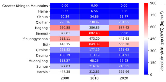 We analyzed the spatio-temporal distribution characteristics of the AYG and RYG for 2000, 2010, and 2020 in Heilongjiang Province, respectively, and identified the regions with large yield gaps. In order to further explore the difference between the AYG and RYG in different prefecture-level cities, we calculated the mean AYG and RYG in different prefecture-level cities of Heilongjiang Province for the three years and identified which cities had the large yield gaps.
