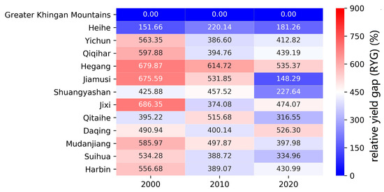 It can be seen in Figure 11 that in 2000, in addition to the Greater Khingan Mountains, Heihe City, and Qitaihe City, the RYG of the remaining nine prefecture-level cities was higher than 400%, indicating that the rice potential yields were more than five times the actual yields, among which the RYG of Hegang City, Jiusi City and Jixi City in Sanjiang Plain region was even close to 700%, and the gaps between the rice actual yields and potential yields were very large. In 2010, the RYG of most prefecture-level cities decreased, and only six prefecture-level cities with RYG higher than 400%, among which the RYG of Hegang City, Jiamusi City, and Qitaihe City located in Sanjiang Plain region was higher than 500%. In 2020, the RYG of most prefecture-level cities continued to decrease, and only five prefecture-level cities with RYG above 400%, among which Hegang City and Jixi City in the Sanjiang Plain region had a higher RYG than other prefecture-level cities. In addition, Daqing City, located in the southwest region, also had a higher RYG (526.30%).