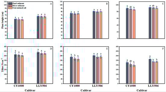 Effects of different types of sediment resources on plant height and tiller number per square meter in different growth stages under salt stress. Within a column, means followed by the same letter are not significantly different at the 0.05 probability level according to the least significant different test (LSD, 0.05). CY1000: Chaoyou1000; LLY506: Longliangyou506. (A,D) represent the mid-tillering stage, (B,E) represent the panicle initiation stage, and (C,F) represent the heading stage.