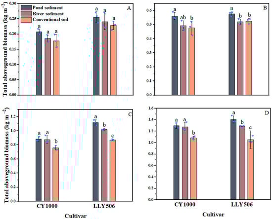 Effects of different types of sediment resources on above-ground dry matter accumulation at different growth stages under salt stress Within a column, means followed by the same letter are not significantly different at the 0.05 probability level according to the least significant different test (LSD, 0.05). CY1000: Chaoyou1000; LLY506: Longliangyou506. (A–D) represent the mid–tillering stage, panicle initiation stage, heading stage, and mature stage, respectively.