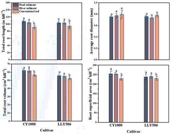 Effects of different types of sediment resources on root morphological indices at panicle stage under salt stress. Note: Within a column, means followed by the same letter are not significantly different at the 0.05 probability level according to the least significant different test (LSD, 0.05). CY1000: Chaoyou1000; LLY506: Longliangyou506.