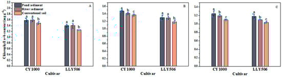 Effects of different types of sediment resources on leaf chlorophyll a + b contents at different growth stages under salt stress. Within a column, means followed by the same letter are not significantly different at the 0.05 probability level according to the least significant different test (LSD, 0.05). CY1000: Chaoyou1000; LLY506: Longliangyou506. (A–C) represent the mid-tillering stage, panicle initiation stage, and heading stage, respectively.