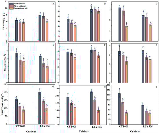 Effects of different types of sediment resources on leaf nitrogen-metabolizing enzyme activities under salt stress Note: Within a column, means followed by the same letter are not significantly different at the 0.05 probability level according to the least significant different test (LSD, 0.05). CY1000: Chaoyou1000; LLY506: Longliangyou506. (A,D,G) represent the mid-tillering stage; (B,E,H) represent the panicle initiation stage; and (C,F,I) represent the heading stage.