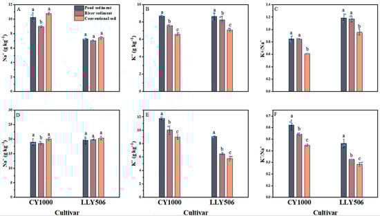 The effects of different types of sediment resources on K+ ion, Na+ ion, and K+/Na+ ratio at ear and maturity stage under salt stress. Within a column, means followed by the same letter are not significantly different at the 0.05 probability level according to the least significant different test (LSD, 0.05). CY1000: Chaoyou1000; LLY506: Longliangyou506. (A–C) represent the heading stage; (D–F) represent the mature stage.