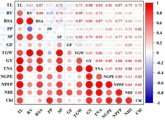 Correlation analysis of yield composition, root morphology, and nitrogen use efficiency of rice. TL: Total length; RV: root volume; RSA: root surface area; PP: productive panicle; SPP: spikelets per panicle; GF: grain filling; TGW: 1000-grain weight; GY: grain yield; TNA: total nitrogen accumulation; NGPE: nitrogen grain production efficiency; NPFP: nitrogen partial factor productivity; NHI: nitrogen harvest index. *: Significant at the p < 0.05 level.