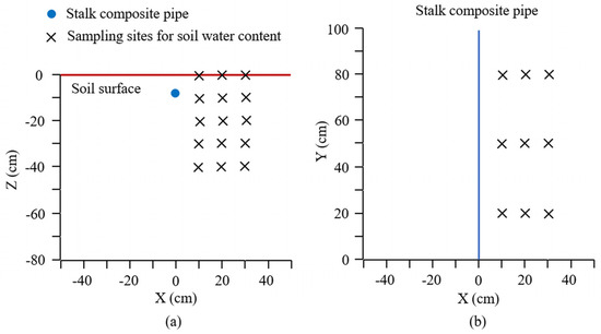 Diagram of sampling sites for soil water content. (a) represents sampling sites in the vertical soil profile, and (b) represents sampling sites in the horizontal soil profile.