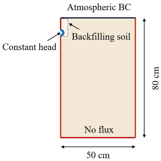 The geometry module in HYDRUS was used to construct the simulation domain. The transport domain (50 cm wide and 80 cm deep) for all treatments was considered axisymmetric around a vertical axis, so we used one side for the simulation (Figure 3). It was discretized into 1626 nodes and 3112 2D elements. In all simulations, the bottom boundary of the transport domain and both sides of the vertical boundaries were defined as no-flux boundaries, whereas the upper boundary of the transport domain was described as an atmospheric boundary. The SCP was located on the left vertical boundary of the transport domain, and it was described as a constant head boundary during the infiltration period. The SCP boundary was changed to a no-flux boundary during the redistribution period.