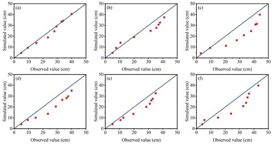 Simulated and observed values of the wetted distance. (a–c) represent horizontal wetted distances of T4, T6, and T8, respectively; (d–f) represent vertical wetted distances of T4, T6, and T8, respectively.