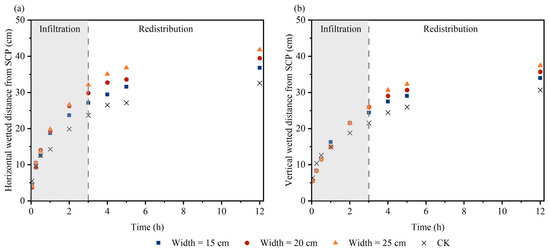 Wetted distance for different burial furrow widths. (a) represents the horizontal direction and (b) represents downward direction.