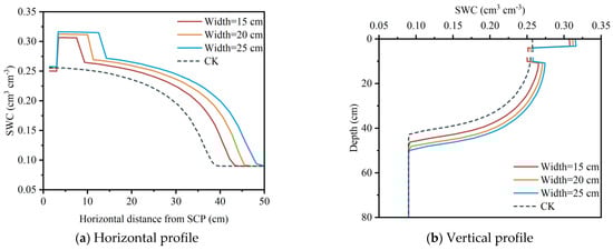 The SWC distribution of horizontal and vertical profiles located at varying distances from the SCP is shown in Figure 7. The wetted areas under SSI were significantly larger than those under moistube irrigation. Furthermore, the greater burial furrow width meant a larger wetted range and higher soil saturation near the SCP, and vice versa. With increasing burial furrow width, the SWC increased more in the horizontal direction than that in the vertical direction. This indicated that increasing the burial furrow width mainly increased the SWC and wetted range in the horizontal direction.