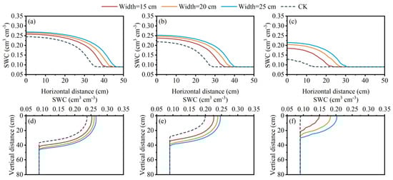 Soil water distribution in horizontal and vertical profiles located at varying distances from the SCP, with different burial furrow widths. (a–c) Horizontal profile at (a) 20 cm, (b) 30 cm, and (c) 40 cm from the surface. (d–f) Vertical profile at (d) 20 cm, (e) 30 cm, and (f) 40 cm from the SCP.